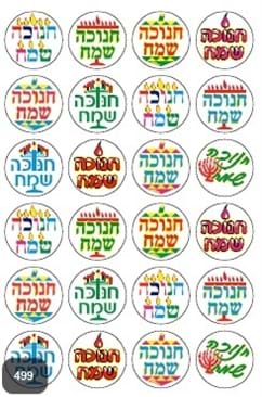 דיבקיות עגולות מודפסות עם כיתוב "חנוכה שמח" וסמלי החג. כל דף מכיל 24 מדבקות * 10 דפים בחבילה.
