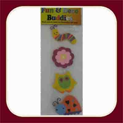 חיתוכי עץ עם דבק דו צדדי בדגם זחל, פרח, ינשוף וחיפושית. כל מארז מכיל גיליון אחד בגודל 5*16 ס"מ בקירוב.